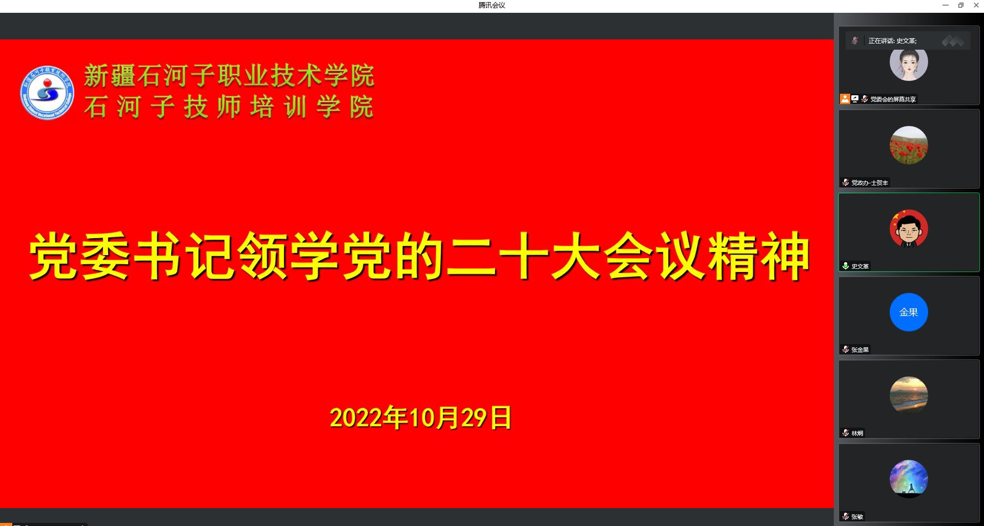 强化责任担当,提升学习党的二十大精神实效。学院党委要求全体教职工要坚持学用结合,切实把学习党的二十大精神的成效转化为做好各项工作的巨大动力,牢记“为党育人,为国育才”的初心和使命,坚定信心、同心同德,踔厉奋发、埋头苦干,加强学习,深入思考,潜心教学改革与研究,努力提高教学水平和教育科学研究水平,为学院创新发展做出新的更大的贡献。史书记在谈到新时代兵团职业教育高质量发展时强调全院要以开展此次二十大精神学习为契机,提升思想站位,统一思想、深化举措,提振精气神、凝聚正能量,认清职业教育发展的大好发展机遇,前景广阔、大有可为。各部门要深入思考,细化工作方案、制定具体措施,加快构建职业体系,围绕学院办学特色推进专业建设,体现职业教育适应性、职业教育要求和学生职业发展诉求,深化校企合作、产教融合,加快实习基地建设,将学院职业教育品牌打造的更响更亮。