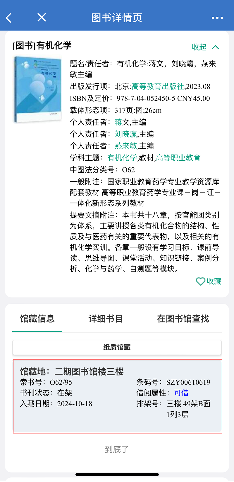 5.在图书详情页面,可查看该图书的基本信息、馆藏信息、图书位置等。