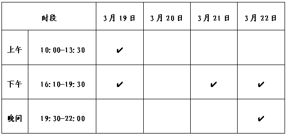 学院图书馆2026年3月19日(星期四)至3月22日(星期日)服务时间安排如下。具体开馆时段请参见下表“✔”标识。
