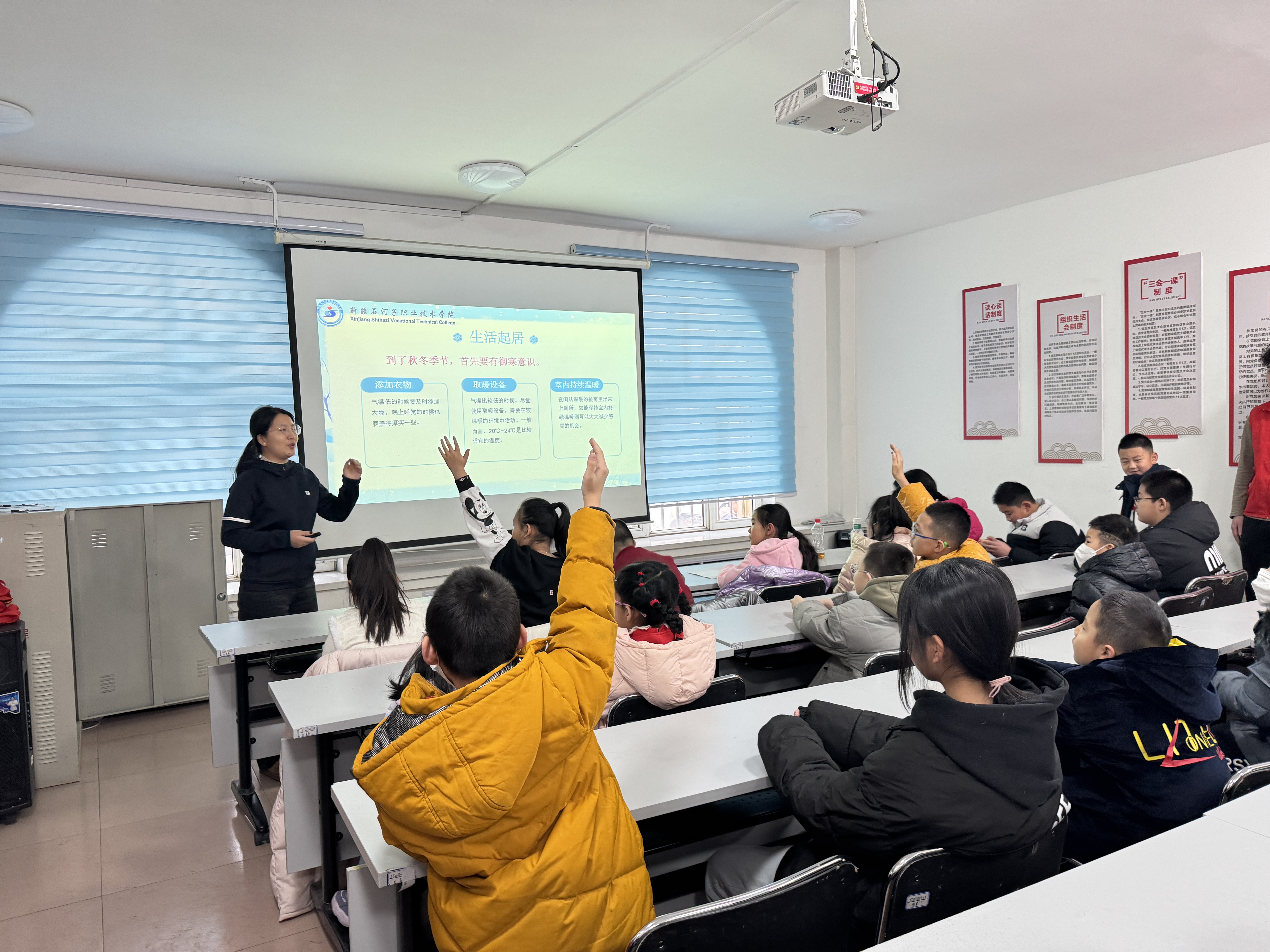 现代服务学院护理专业教师发挥专业特长,进行了“冬季健康保健”的专题宣讲活动,进一步提升了社区居民对常见疾病预防的了解,同时传播健康护理知识。教师们为到场的社区居民及小朋友们细心讲解:冬季疾病的类型、饮食如何健康搭配、生活起居温馨提醒、健康”四测”等内容;护理专业的学生志愿者们耐心示范水银血压计如何使用。在老少共建文明社区文艺活动中,学生为居民朋友们献上文艺表演,他们以饱满的热情和青春的舞姿,展示了青年的风采,并耐心细致地指导到场的小朋友们学习舞蹈动作。书法活动现场,书法家、志愿者们齐心协力、热诚送福,书法老师摆好笔墨纸砚,现场挥毫泼墨,笔锋刚劲有力又灵动飘逸,一个个寓意吉祥、饱含祝福的大字在红纸上熠熠生辉,志愿者们帮忙选春联、写春联、晾春联、维护现场秩序。