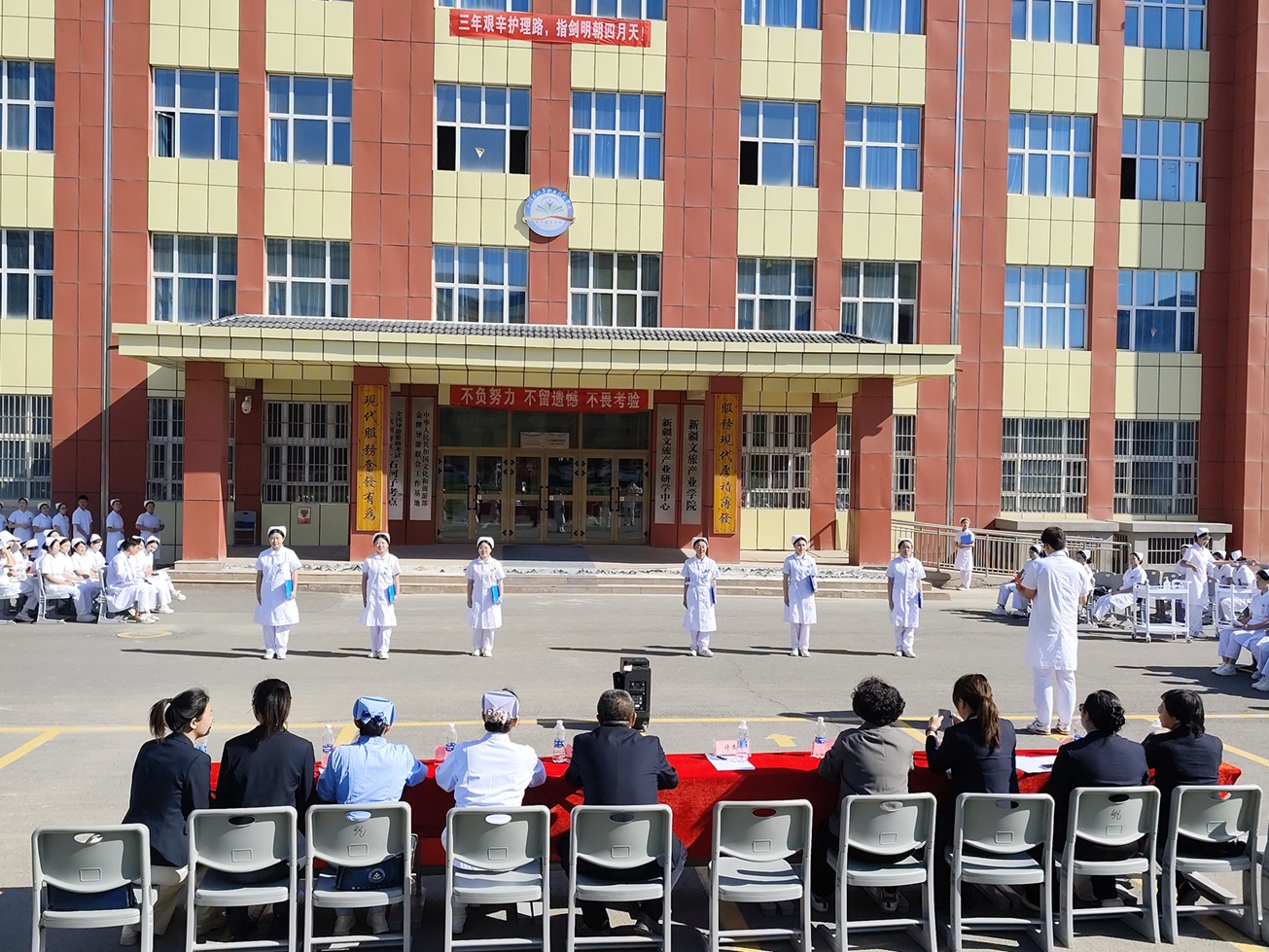 (王似雄 报道)为提升学生职业素养,弘扬护理人文精神,2025年4月26日现代服务学院举办“行优雅礼仪,展护理风采”礼仪展示活动。学校教务处郁杨副处长、银龄专家康俊凤老师、石河子市人民医院曹炜老师,学院领导、护理教研室老师及护理专业的120余名学生参加活动。