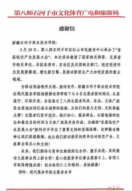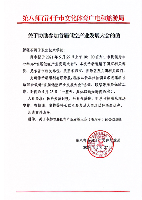第八师石河子市文化体育广电和旅游局 关于协助参加首届低空产业发展大会的函