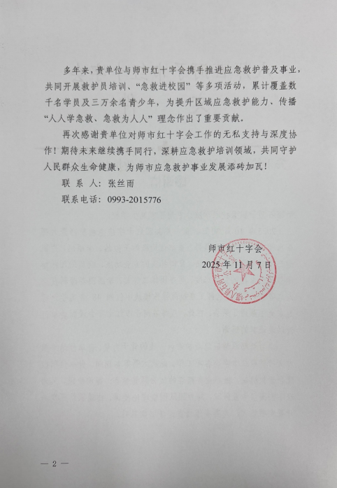 关于第一届兵团红十字应急救护师资大赛的感谢信