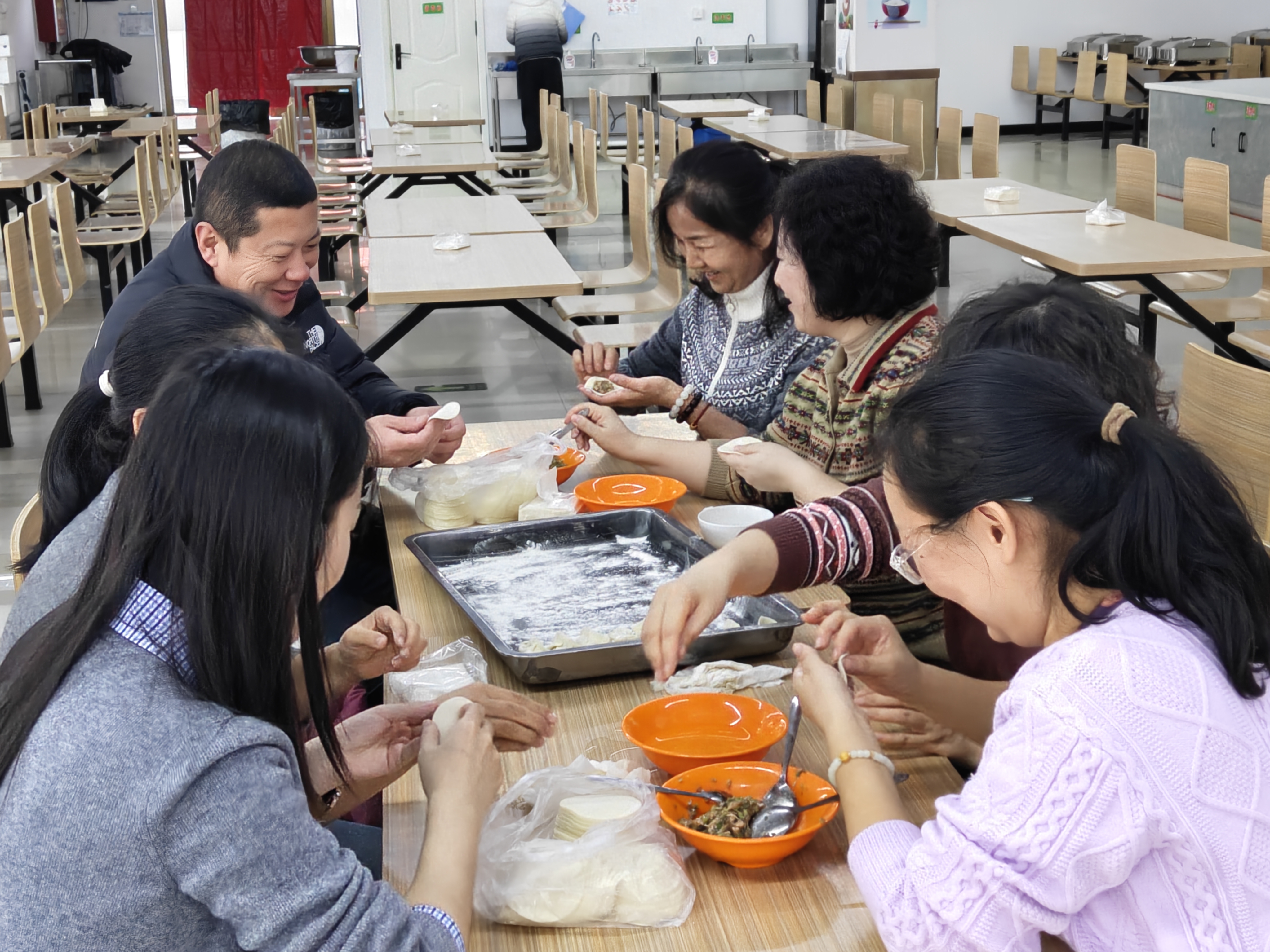 学院各党支部党建会议室、教职工食堂、专业实训室等处,处处洋溢着温馨热闹的氛围。在各工会小组的精心组织下,教职工们分工协作、默契配合,揉面、擀皮、包馅等工序有条不紊,现场欢声笑语不断。党员教师积极发挥先锋模范作用,主动承担活动协调、物资准备等工作,在劳动间隙与群众教师深入交流思想、探讨育人工作,进一步拉近了党群距离、凝聚了奋进合力。各工会小组巧思融入党建元素,让活动既有“烟火气”更有“红色味”:有的小组开展了党的创新理论微宣讲;有的则结合专业特色,将饺子包成象征“同心圆”“团结籽”等造型,以具象化的形式表达团结一心、深耕育人的共同愿景。热气腾腾的饺子不仅驱散了严寒,更凝聚了人心。一位参与活动的青年教师表示:“和同事们一起动手包饺子、话家常,感受到了浓浓的归属感。饺子吃起来格外香,心里也特别暖。”