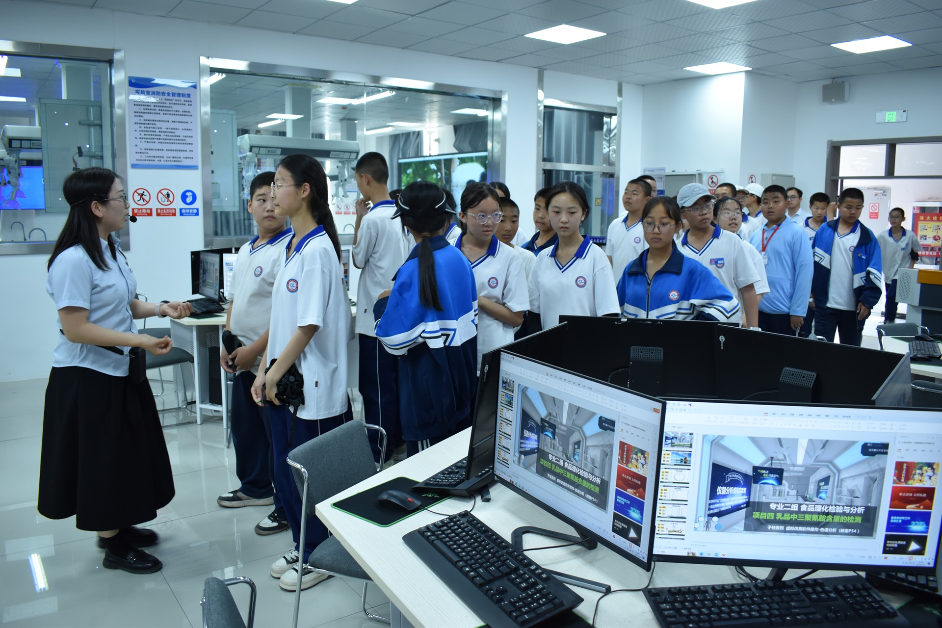 在爱国主义教育基地,思政教师团队以兵团老兵屯垦戍边的光辉事迹为切入点,通过智能交互系统展示新时代新疆发展成就,向青少年提问“作为新时代'小胡杨',我们该如何接续奋斗?”这一问题随即在青少年间引起热烈讨论,青少年纷纷表示,自己要像兵团前辈那样,把个人理想种在祖国最需要的地方;当实践课堂转入食品化工综合实训基地,精密的分析仪器与现代化的生产线瞬间点燃了青少年的好奇心,食品工程学院教师讲解了农残检测操作具体流程,并顺势引导:“守护‘舌尖上的安全’不仅需要责任心,更要掌握精准的检测技术。”青少年通过分组参观食品快检设备、观摩食品检测流程,深刻感受食品安全的重要性;工程实训中心的智能工厂模拟区则成为“未来工程师”的启蒙课堂。“智能制造如何创造新职业?未来的技术工人需要哪些核心能力?”机械电气工程学院教师向青少年提出实践性议题。青少年通过参观可编程控制器、工业机器人等实训室,引发了对“科教兴国”战略的思考。青少年在观摩PLC编程中兴奋地感慨:“原来编程就像拼乐高,每一步都影响最终结果,工程师必须既严谨又有创意!”