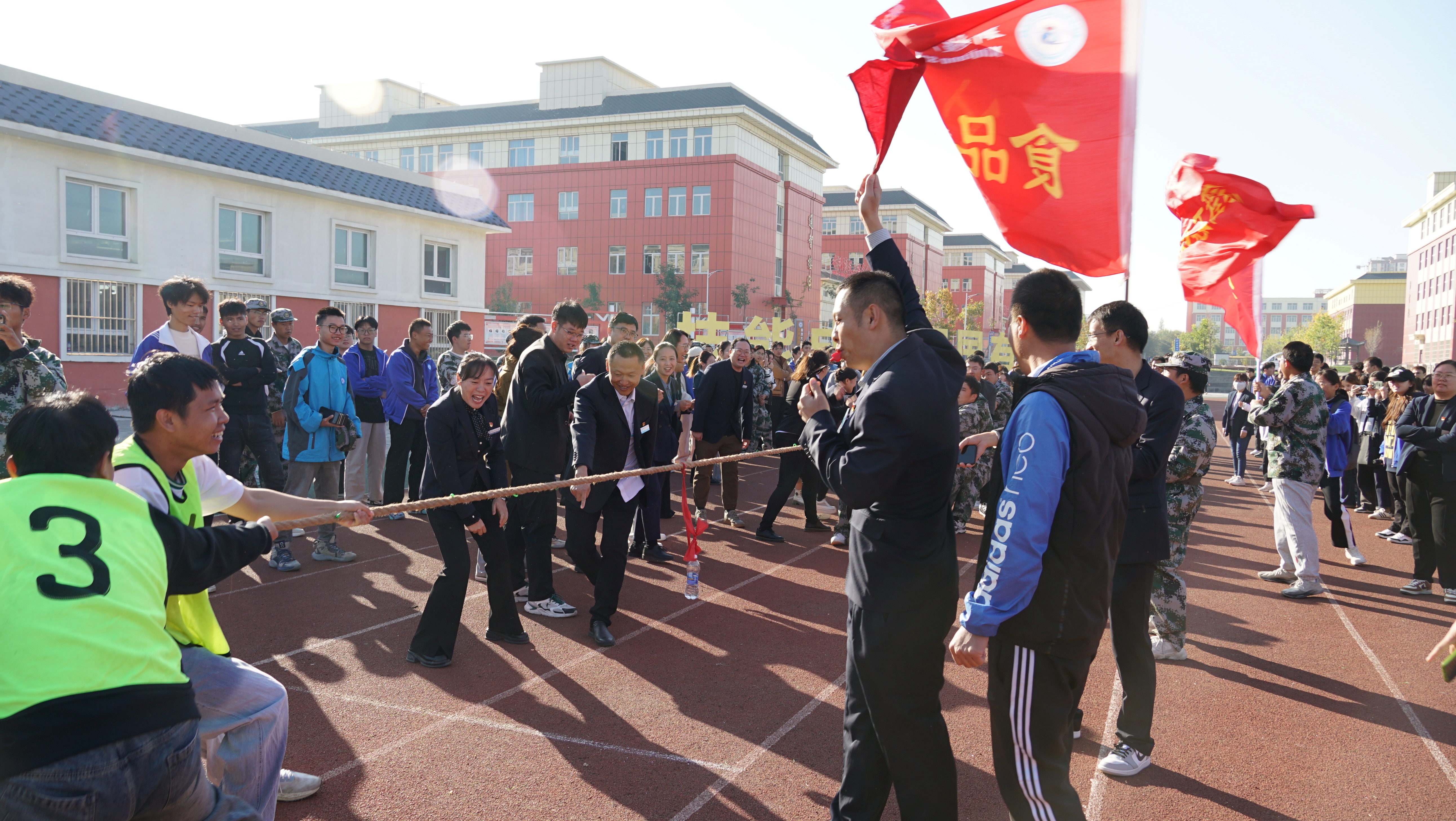 上午10时,升旗仪式在雄壮的国歌声中拉开序幕,全校师生肃立,注视着五星红旗冉冉升起,共同表达对祖国的热爱与祝福。升旗仪式结束后,拔河比赛的哨声随即响起,为节日的校园增添了浓厚的喜庆氛围。第一场比赛在食品化工学院与现代服务学院的学生之间展开。双方队员都鼓足了劲,紧紧抓住绳子,脚蹬着地,身体后倾。食品化工学院的队员们配合默契,他们喊着整齐的口号,一步步将绳子拉向自己一方,最终赢得了第一场比赛的胜利。紧接着,第二场比赛在信息与通信工程学院与数字商贸学院之间进行。这也是一场激烈的角逐,信息与通信工程学院的选手们展现出强大的力量和坚韧的毅力,在你来我往的相持中,成功战胜数字商贸学院。