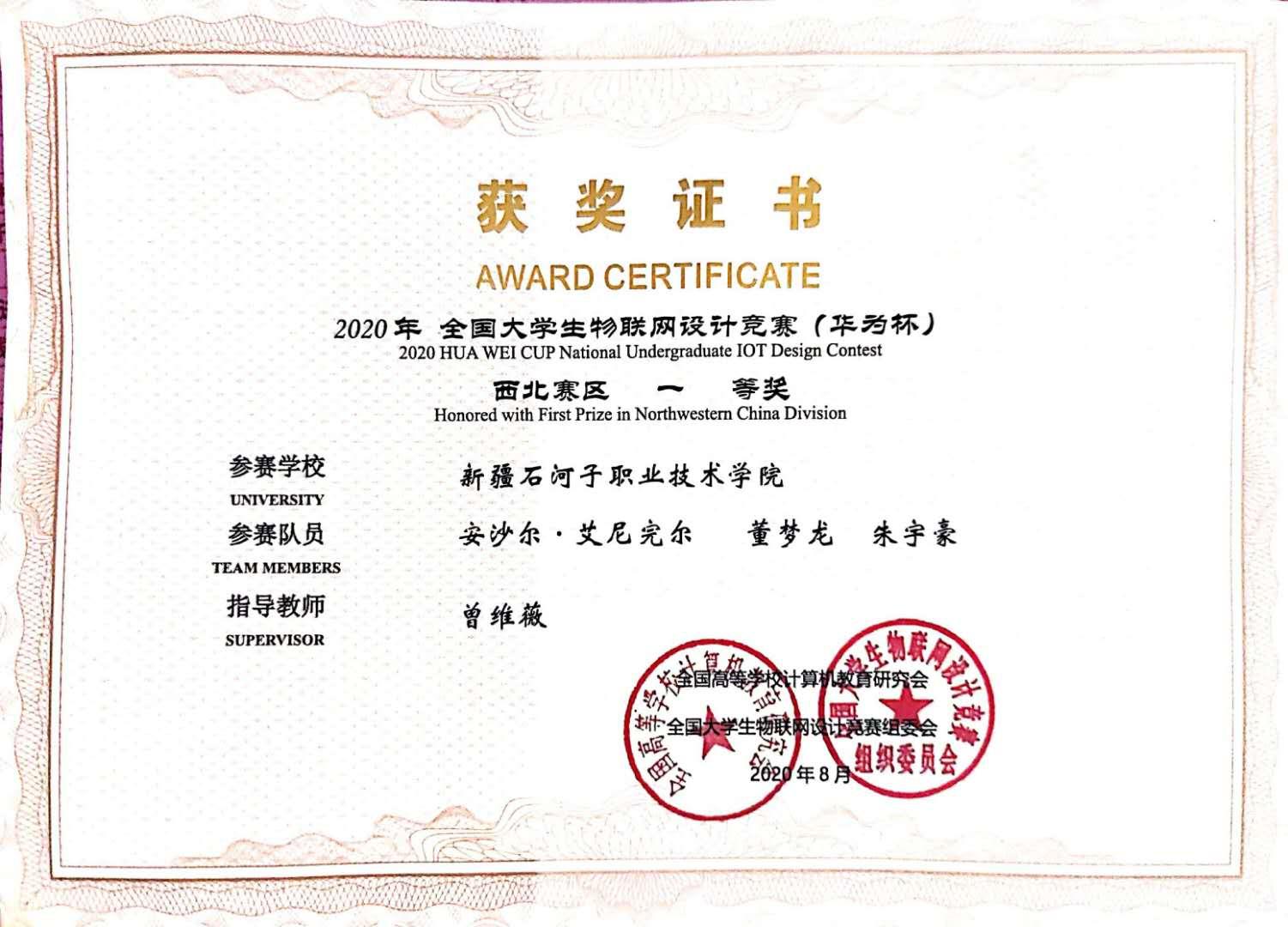 2020年全国大学生物联网设计竞赛是面向全国大学生,特别是本科院校学生的竞赛。5月初,我院曾维薇老师带领信息工程分院的三位学生,在疫情防控的大环境下,利用学院有限设备和条件,从项目规划,可行性分析,到项目设计实施,前后历时三个月,没有节假日,主动放弃实习机会,全力以赴准备比赛,最终参赛获奖。在新疆地区初赛中,有塔里木大学,新疆大学,乌鲁木齐职业大学,新疆农业职业技术学院等20多个队伍参加了比赛。经过激烈的比拼后,我院参赛队获得新疆赛区第一名,作为新疆仅有的一只参赛队晋级西北赛区决赛。在西北赛区决赛中,我院参赛队作为唯一所职业技术学院,与西安交通大学、兰州大学、郑州大学、中国人民解放军战略支援部队信息工程大学等本科学院展开激烈竞争,最终打败了一大批本科院校,获得西北赛区一等奖的好成绩。