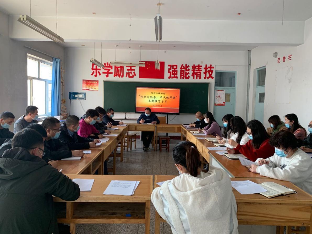 为进一步加强对“四史”的系统化学习,使我分院教师更加深入地理解和把握当前面临的新形势、新任务、新要求,明确当代教师教书育人的职责所在,2021年3月25日下午6点,信息工程分院在信息楼303教室召开分院管理及班主任培训会,会议由信息分院书记徐通主持,信息分院院长荣喜丰、副院长周鑫及分院全体教师参加了此次会议。