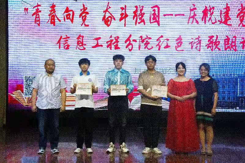 为庆祝中国共产党成立100周年之际,歌颂党的伟大成就,传承红色基因,坚守初心使命,信息工程分院于2021年6月1日下午6点10分,在综合楼四楼阶梯教室举办了“青春向党,奋斗强国——庆祝建党一百周年”诗歌朗诵会。