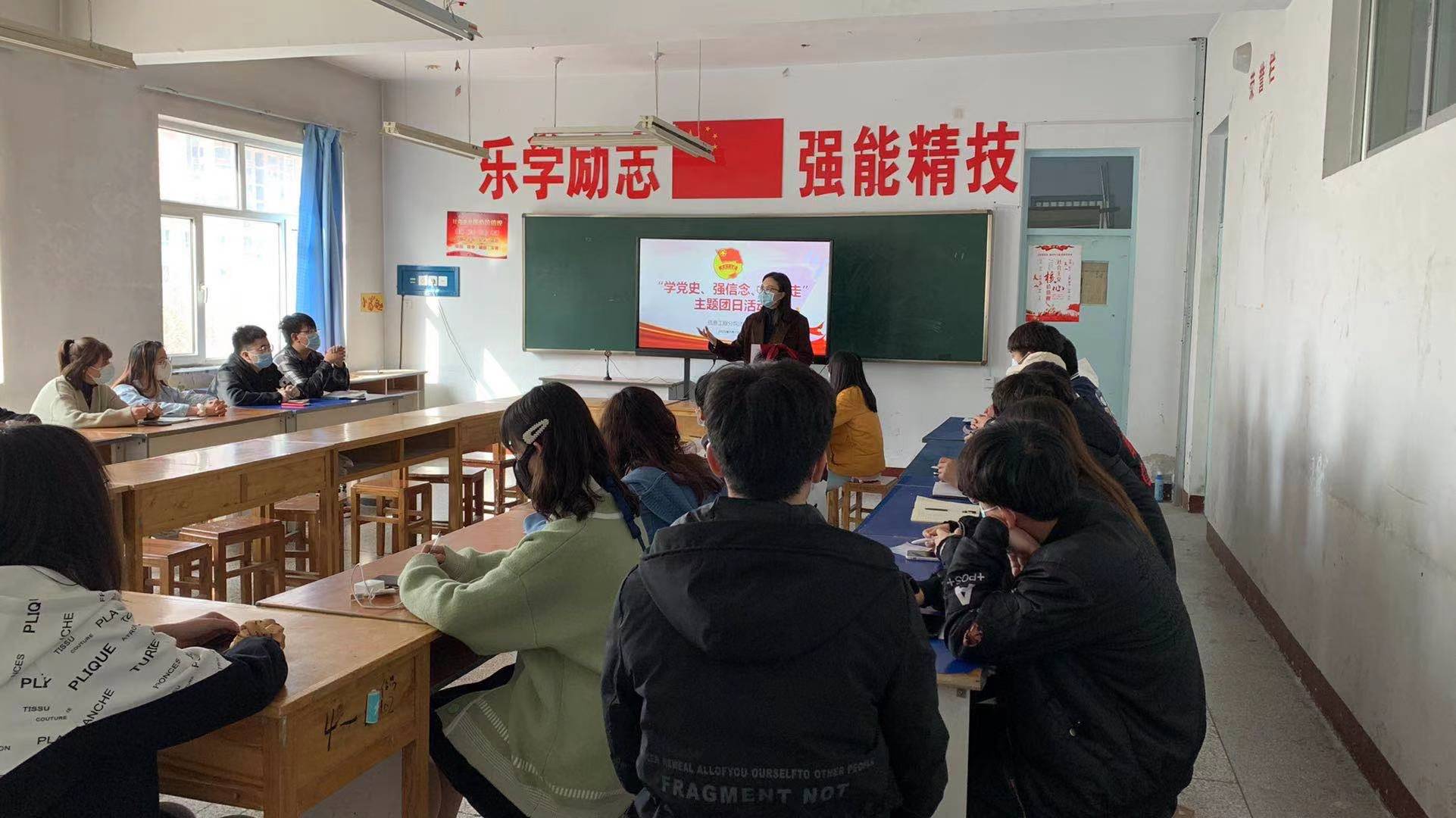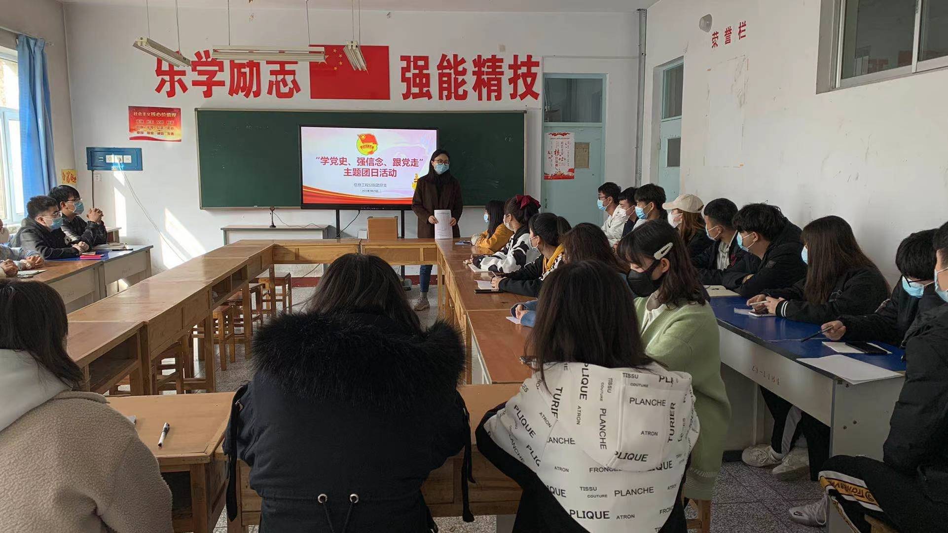 此次活动由信息分院团总支牵头,组织分院各团支部积极参与,开展以“学党史 强信念 跟党走”为主题的宣传教育活动。在此次活动中刘佩佩老师向团员们讲述要坚持“学党史、强信念、跟党走”的教育目标,加强党史学习,将学习精神发挥到日常校园生活中,并且以五四精神为内容激励大家在日后的工作学习中发挥出青少年的活力与精神。同时各团支部利用晚自习的时间开展了关于党史经验交流会,并向班内同学分享先烈们的红船、井冈山等伟大革命精神,讲述党史故事,带动广大青少年了解党的光辉历史,增进对党的感情和信赖。