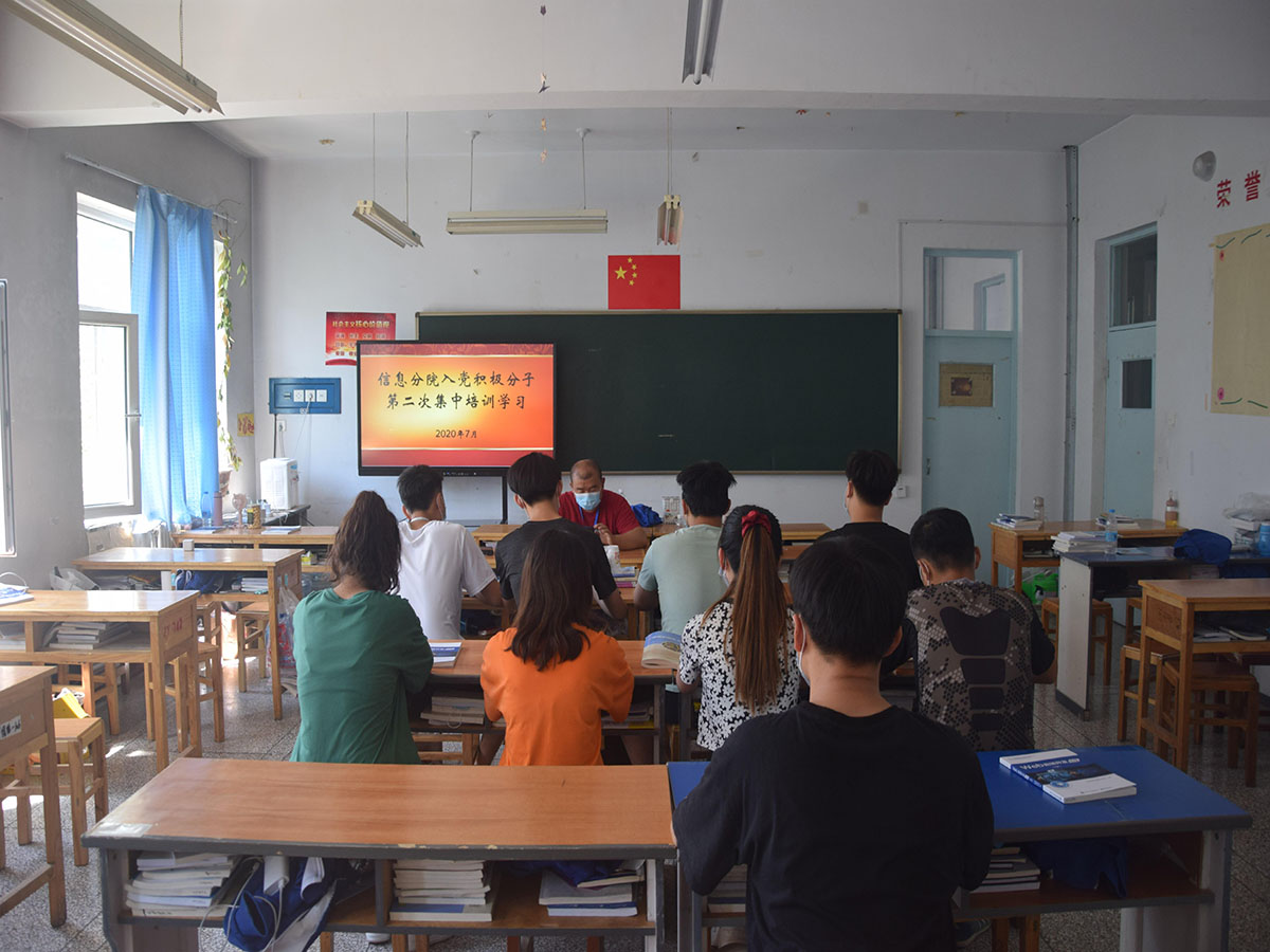 为不断提高思想境界,早日向党组织靠拢,信息工程分院于7月16日中午13:00,在信息院303教室进行了入党积极分子培训第二次集体学习,由信息院副院长周鑫主持,全体入党积极分子学生参加。学习主要有三个内容首先由周鑫副院长带领大家集中学习了《习近平总书记给中国石油大学克拉玛依毕业生们的回信》;随后,检查了大家学习强国的学习情况,大家就回信内容进行了讨论,并汇报了入校以来阶段的思想情况,最后,周鑫副院长要求大家会后继续找各自培养人进行思想汇报,扎实自己的学习成果,查缺补漏,不断坚定自己的理想信念。通过此次学习,同学们纷纷表示作为入党积极分子,应当努力学习,艰苦奋斗,实事求是,时刻准备为实现中华民族的伟大复兴而奉献自己的力量。