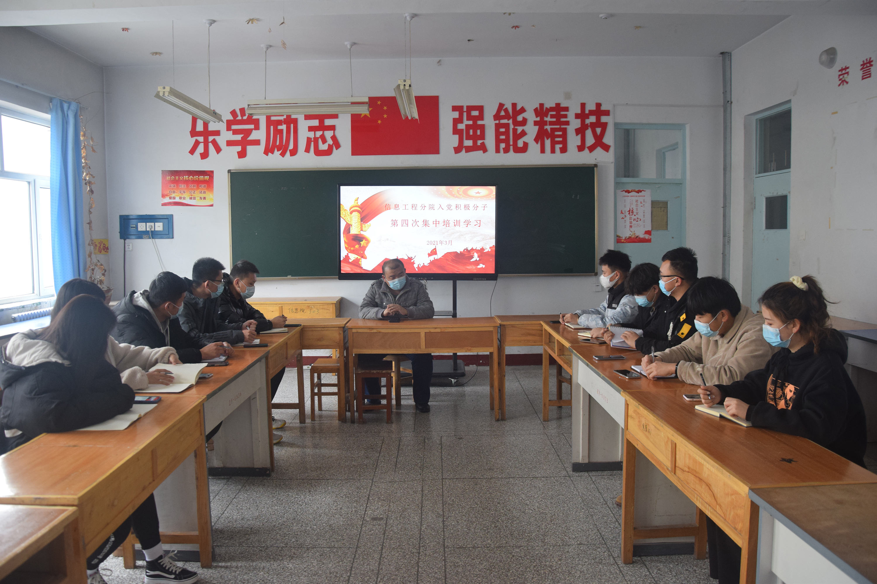 3月11日下午14时30分,信息工程分院在信息楼303教室开展了培养期内第四次入党积极分子集中学习教育活动,活动由分院副院长周鑫主持,分院全体入党积极分子学生参加。本期学习主要布置安排了按时观看石职之声平台发布的《党史故事100讲》视频;检查学习强国手机APP的学习积分情况和近期时事政治、理论新知识的学习交流。