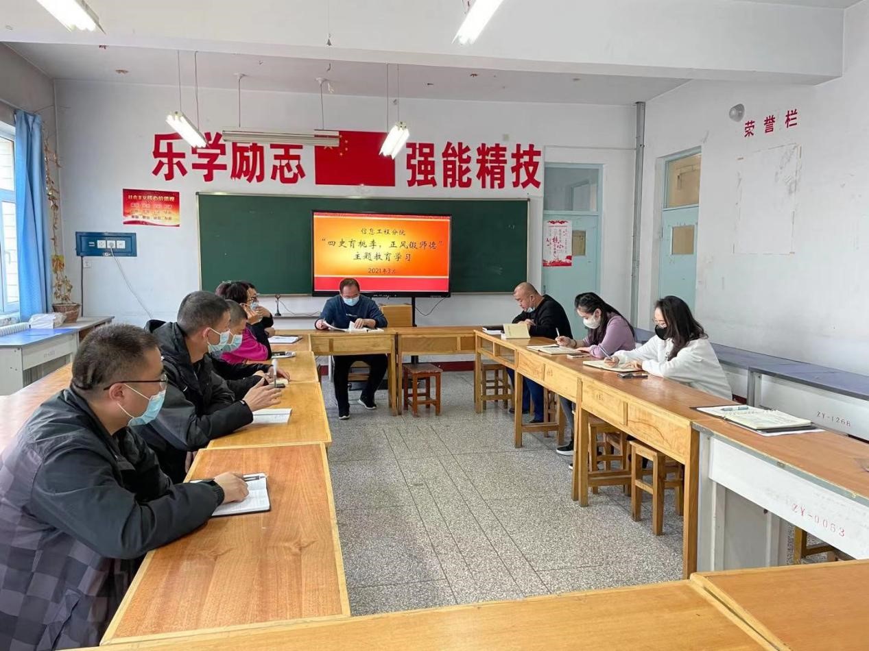 为了进一步强化党员教师理想信念教育,加强师德师风建设,增强党员教师做好立德树人工作的责任感和使命感,2021年3月25日下午6点,信息工程分院党支部在信息楼303教室开展“四史育桃李,正风锻师德”主题教育学习活动,活动由信息分院党支部书记徐通主持,分院党支部12名党员参加了此次活动。