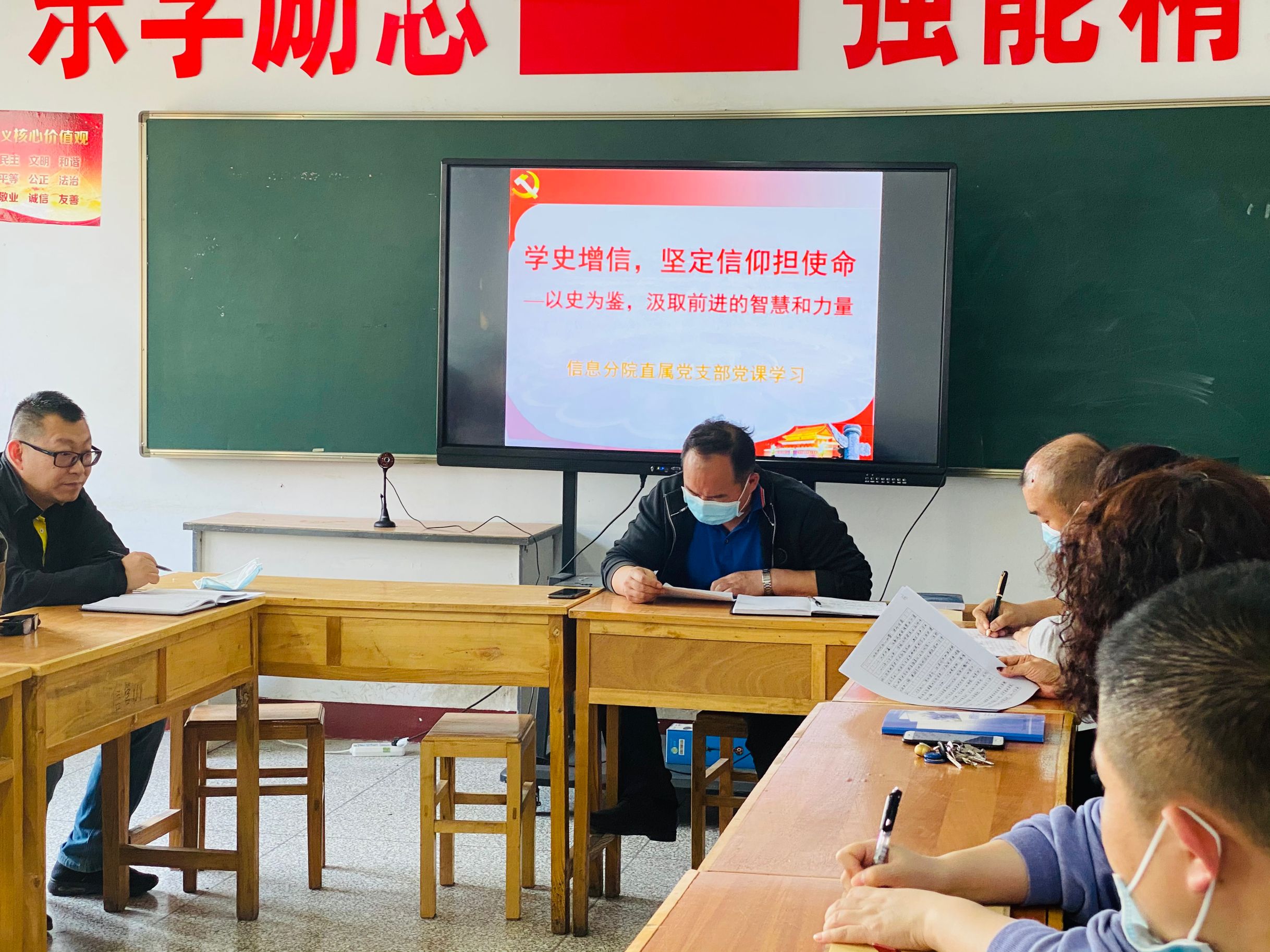 4月9日下午18:20,信息工程分院直属党支部在信息楼303室召开党员大会,会议由分院书记徐通主持,全体党员参加,会议的主题是:“坚定信仰担使命——以史为鉴,汲取前进的智慧和力量”集中学习。在学习中,徐通书记带领大家学习了《中国共产党简史》第四章、第五章的内容,主要讲述了从抗日战争胜利后到新中国建立的历史。各位党员认真聆听,对新中国成立的艰难记忆十分深刻,广大党员们还积极发言,讨论了与之相关的《大决战》、《建国伟业》等影视作品,通过文字叙述加影视投射,让同志们都有了认识的提高和思想觉悟的深化,更深刻的体会到我们党一路走来的艰辛。