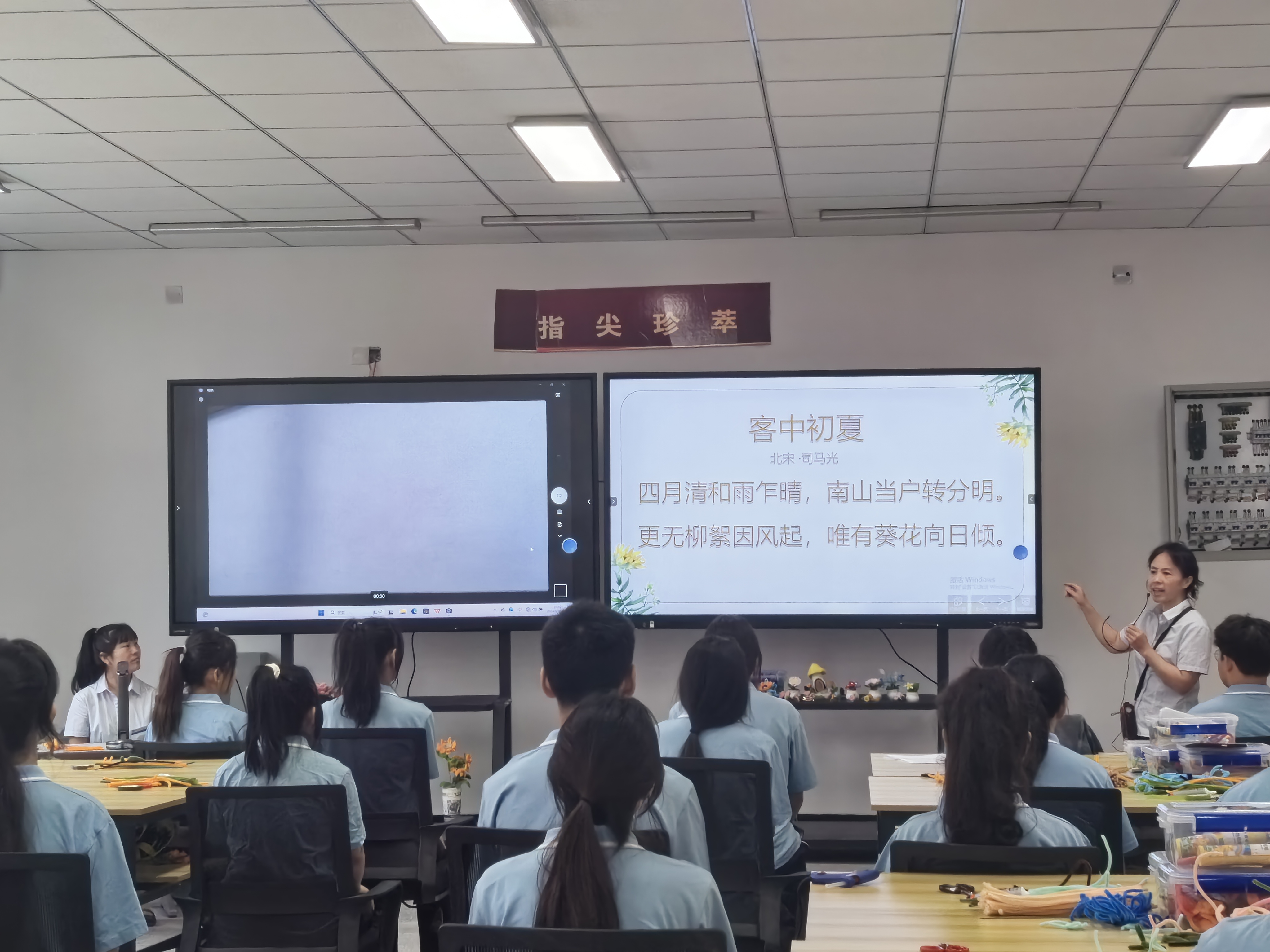 在讲课过程中,教师们充分展示了三教改革在教学内容和教学方法上的创新。《计算机网络基础》课程首次尝试与基础课英语的教学改革,专业课教师刘光富激情地为学生讲解专业知识,英语教师周丽用流利、悦耳、精炼的教学语言,引导学生学习专业课中遇到的重点英文词语,积极调动学生的发散式思维,加深对课程中出现的重点词语的理解和记忆,在课程实践环节,企业工程师罗超向学生展示如何将专业理论知识应用于实际情况,并指导学生动手实践,提高了学生的专业学习效果和实践能力;《立体构成》课程尝试与公共基础课语文的教学改革,在课程导入环节,仿绒花非遗传承人张晓玲以拍摄视频的形式向观摩师生展示向日葵的制作过程,语文教师曾小凌将诗词《客中初夏》中向日葵向阳而生的精神与专业知识融合,在教学过程中,专业课教师陈峙米为学生讲解了向日葵制作的每一步细节,王文卉老师通过高拍仪组织学生一同制作向日葵。