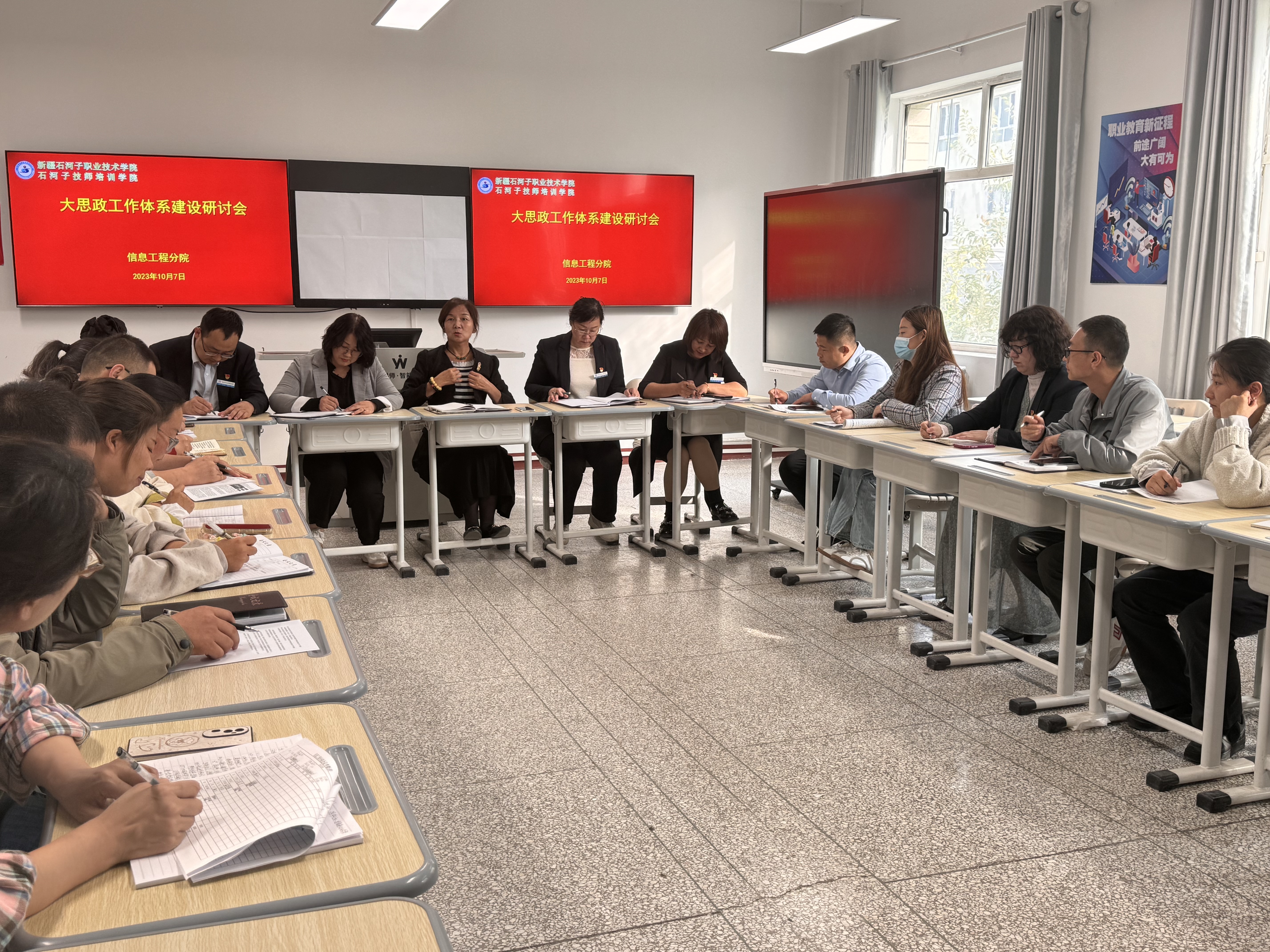 (崔安琪 报道)为深入贯彻落实习近平总书记关于“大思政课”的重要指示批示,坚持不懈用习近平新时代中国特色社会主义思想铸魂育人,抓好意识形态教育,全面推进学院大思政体系建设,2023年10月7日下午,Beat365中文官方网站大思政体系建设研讨会在信息工程分院301教室展开。思政部、社科部、教务处、科研处负责人,信息工程分院书记、分院综合办、各教研室主任和骨干教师代表等参加会议。会议由马晓燕书记主持。