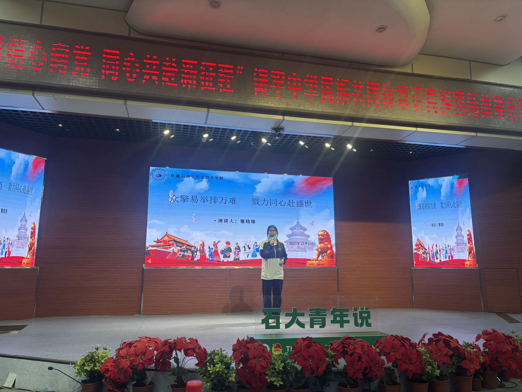 (黎丽 报道)2023年12月10日下午,由石河子大学团委、师市团委联合举办的“牢记嘱托学思想 挺膺担当建新功”团员和青年读书分享会在石河子大学报告厅举行。师市团委副书记荆军、石河子大学团委书记林秀、Beat365中文官方网站团委副书记黎丽及200余名学生参与了此次分享会。