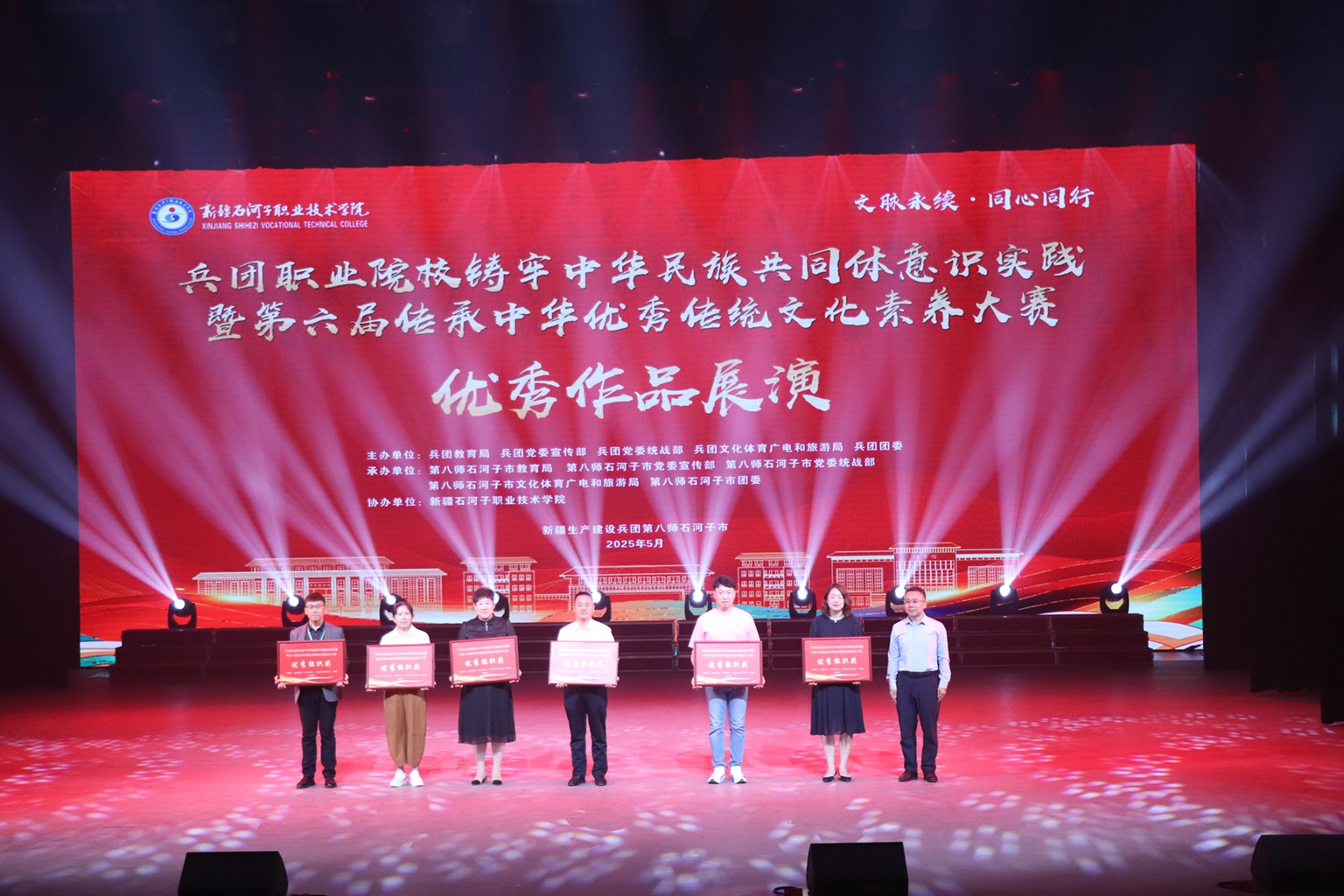 在优秀篇目展演环节,精彩纷呈的节目轮番上演。舞蹈《马摇玲响幸福歌》《乘愿归来》《锦绣兵团》以恢弘的舞姿生动演绎了兵团儿女建设边疆、奉献祖国的赤子情怀;戏曲《谁说女子不如男》《穆桂英挂帅》以铿锵有力的唱腔彰显了女性的巾帼豪情;古筝演奏《井冈山上太阳红》、民族器乐歌舞《常山战鼓》用音符编织出中华文化的深邃意境;经典名篇诵读《寸心寄华夏》《千年一韵舞动诗魂》以深情的语言传递青年学子对祖国的炽热情怀;歌曲《兵团职教追梦人》以激昂的旋律唱响职业教育发展的时代强音;传统舞蹈《象山水月》《虞美人·听雨》《灯影秦淮》让观众领略了传统艺术的独特魅力。表演者们以饱满的热情投入表演,为观众带来了一场震撼心灵的视听盛宴,深刻展现了中华优秀传统文化的深邃内涵,赢得了在场观众经久不息的热烈掌声。兵团教育局党组成员、副局长赵首辰为本次大赛中获优秀组织奖的6所中、高职院校颁奖。