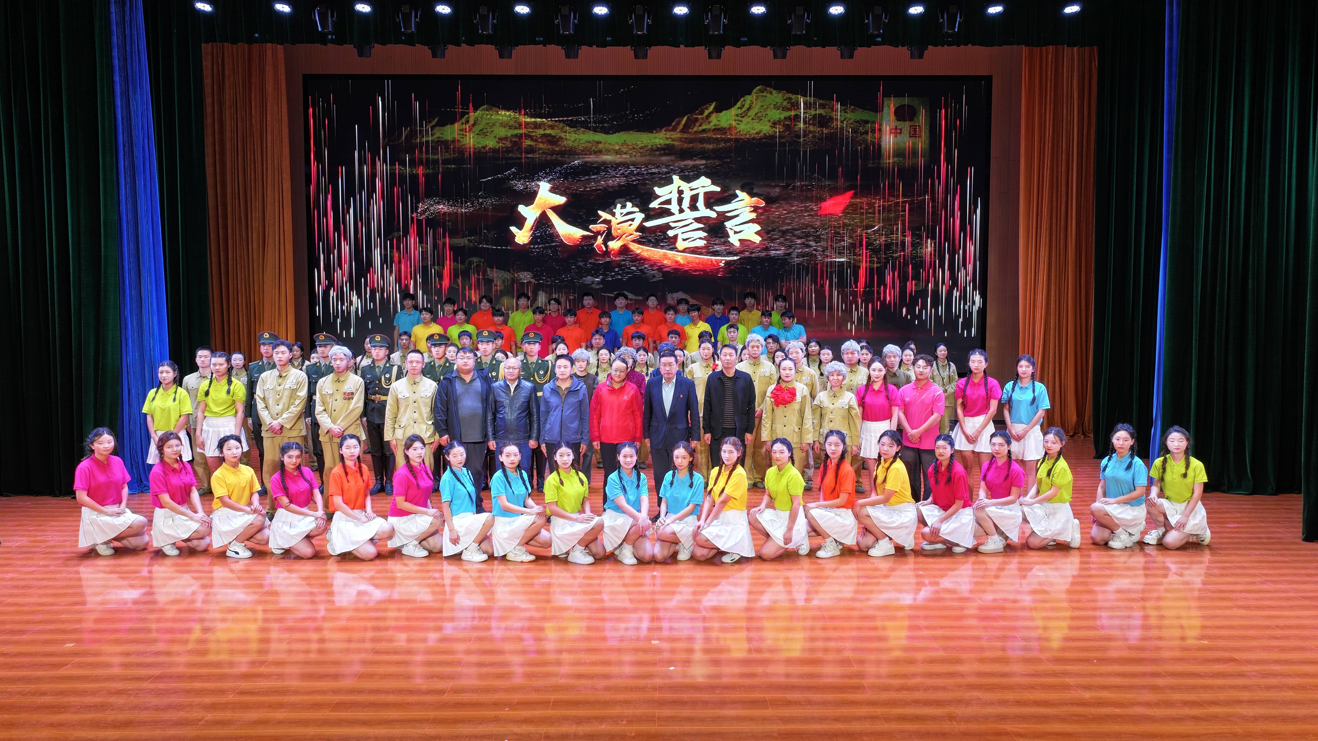 作为一部由师生自编、自导、自演的“青春之作”,《大漠誓言》的舞台始终跃动着年轻的力量:既有参与过多场巡演、已褪去青涩的大二“老演员”,也有初登舞台、眼里闪着光芒的大一“新力量”。他们以语言的张力、舞蹈的韵律、音乐的共鸣与画面的交织,沿着“祖孙二人翻阅日记”的温情主线,将沙海老兵扎根大漠的坚韧、进疆女兵跨越千里的奉献、雪夜战士以命护界的悲壮、第一代女拖拉机手金茂芳深耕荒原的智慧……一个个散落在历史深处的兵团故事,串珠成链般鲜活重现于舞台。当“老照片”化作动态场景,当“日记文字”跃升为情感对话,观众在光影流转中与先辈“对话”,在艺术共情里完成精神传承。