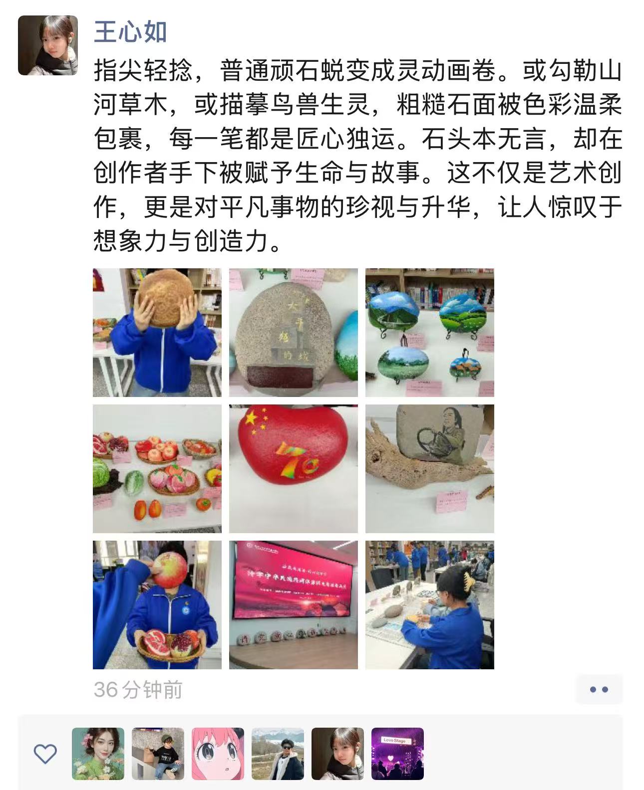 观展结束后,学员们纷纷与心仪的石头画打卡合影,用镜头记录下这份独特的感动;还有学员自发拍摄15秒快闪视频,将石头画里的兵团故事分享给更多同学。“以前觉得‘时代担当’很大,现在才明白,它就藏在前辈的奋斗里,藏在我们当下的每一次努力中。”一位学员在快闪视频里这样说道。此次石头画展览思政实践课,不仅让青马学员读懂了兵团精神的丰富内涵,更让他们找到了青春与使命的连接点。
