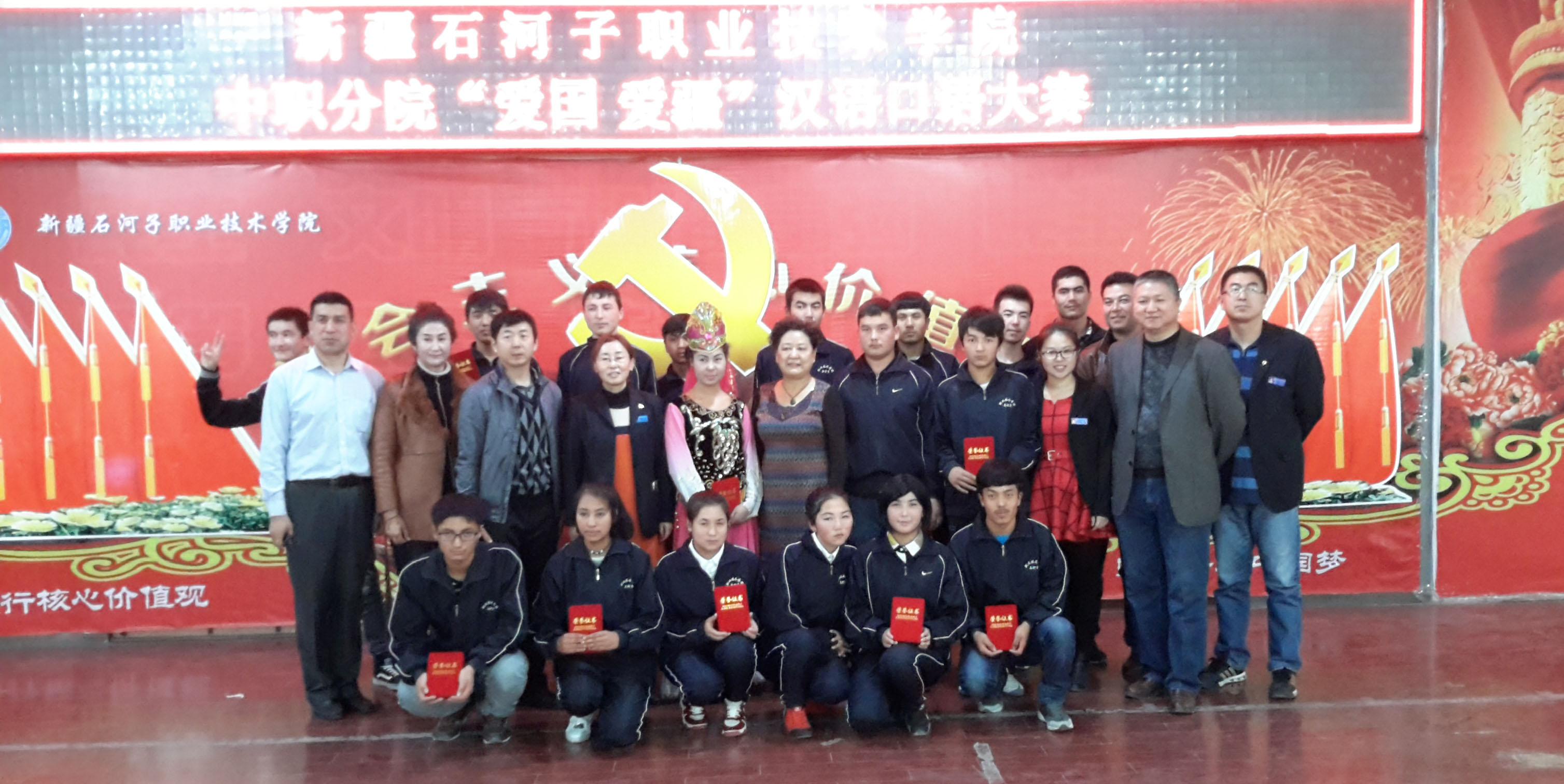 为了加强民族 “两后生”对汉语口语的重视,提高同学们的汉语水平,丰富同学们的校园生活,给同学们一个展现自我的舞台。2015年11月13号下午16点30分,中职分院以“爱国、爱疆”为主题举办了汉语口语大赛,活动在五栋阶梯教室顺利举行。出席本次大赛的领导有石河子职业技术学院管和疆副院长、中职分院吴晓晖院长、俞峰书记、马木提副院长、曹英军副院长,并邀请中职分院领导及老师共八人担任评委及记分人员。